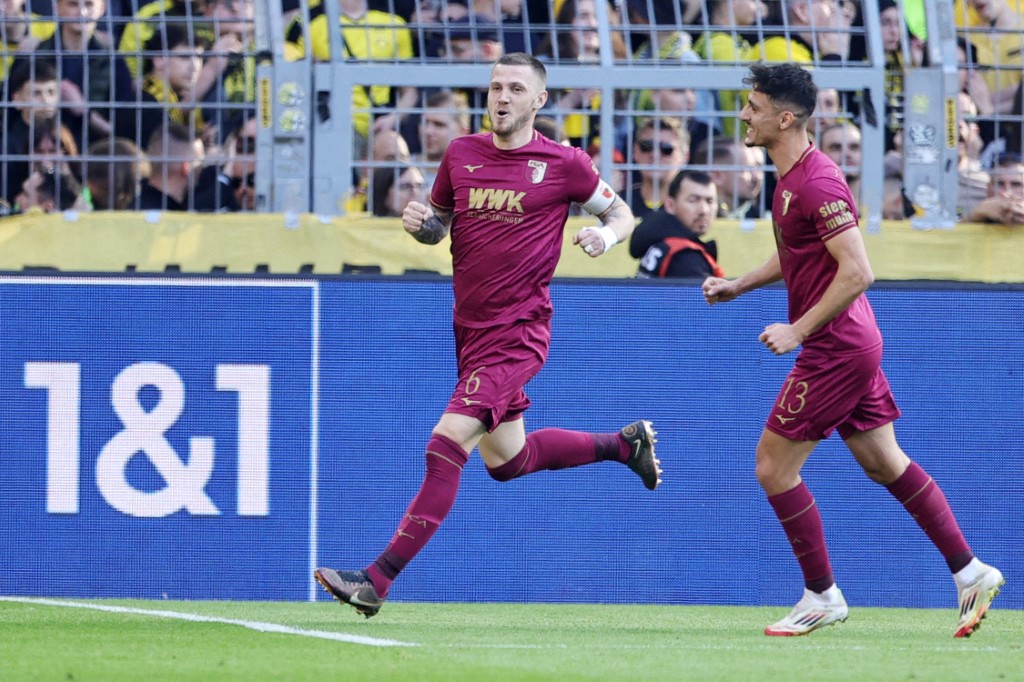Jeffrey Gouweleeuw (6) of FC Augsburg celebrates his goal 0-1 with Dimitris Giannoulis during the German championship Bundesliga football match between Borussia Dortmund and FC Augsburg on 8 March 2025 at Signal Iduna Park in Dortmund, Germany – Photo Jan Fromme / firo Sportphoto / DPPI (Photo by Jan Fromme / firo Sportphoto / DPPI via AFP)