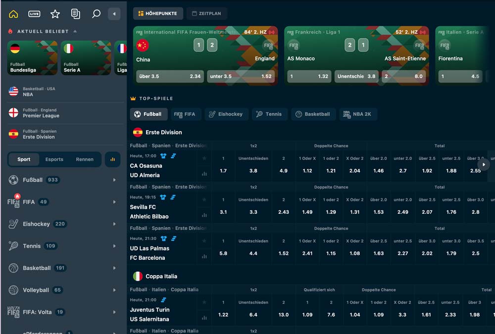 Wettangebot: Fußball und vieles mehr sowie ein eigener Bereich für eSports als attraktive Zugabe
