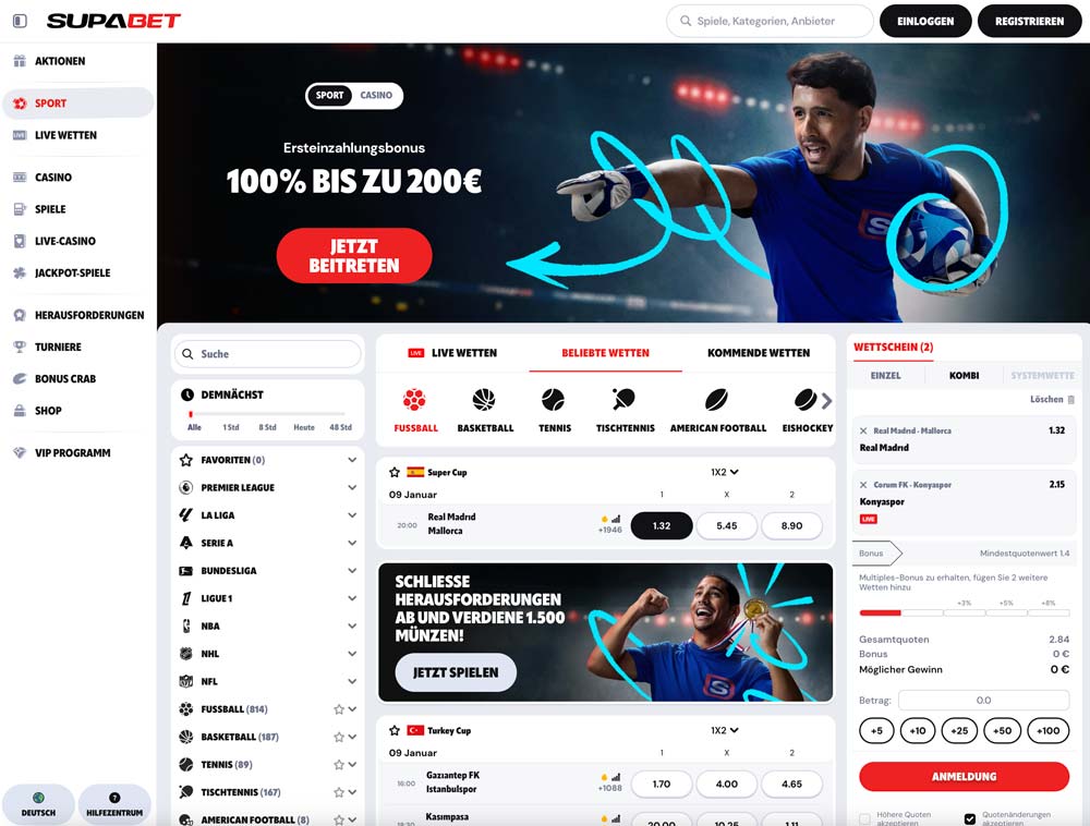 SupaBet bietet ein beeindruckendes und vielseitiges Sportwetten-Angebot mit einer Vielzahl an Wettmärkten und attraktiven Quoten. Die Plattform spricht Wettbegeisterte aller Art an und überzeugt mit einer breiten Auswahl an Sportarten und Veranstaltungen. Besonders Fußballfans kommen hier auf ihre Kosten, aber auch Liebhaber anderer Sportarten finden zahlreiche interessante Wettmöglichkeiten.