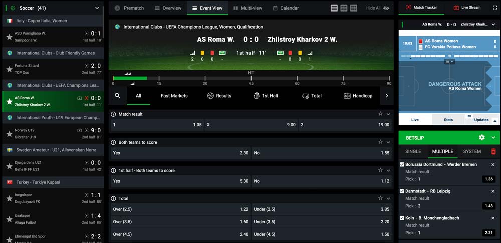 Pluspunkte gibt es von unserer Seite für die Option „Multi-Ansicht“, womit man als Kunde mehrere Events parallel verfolgen kann und ohne lästiges Klicken blitzschnell seine Wetten platzieren kann, wenn sich im Spiel etwas ändert.