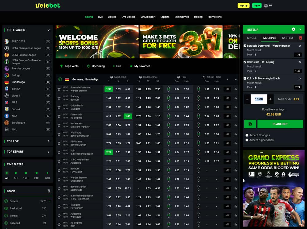 Um das Navigieren zu vereinfachen, können die bewettbaren Partien über die Fahnen der Länder ganz leicht gefunden werden. Zudem befinden sich die wichtigsten und bekanntesten Ligen & Wettbewerbe als Highlights ganz oben im Wettbaum. So am Beispiel von Deutschland die Spiele der Bundesliga und 2. Bundesliga, zudem hat Velobet für Fans des deutschen Vereinsfußballs aber auch die 3. Liga sowie Matches aus den verschiedenen Regionalligen im Angebot.