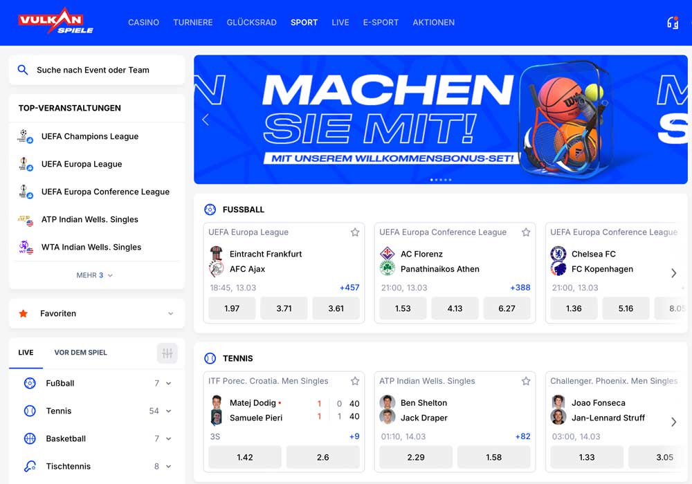 Neben Fußball überzeugt VulkanSpiele mit einer großen Auswahl an Sportarten. Ob große Events oder Nischenmärkte – hier gibt es zahlreiche Wettmöglichkeiten: